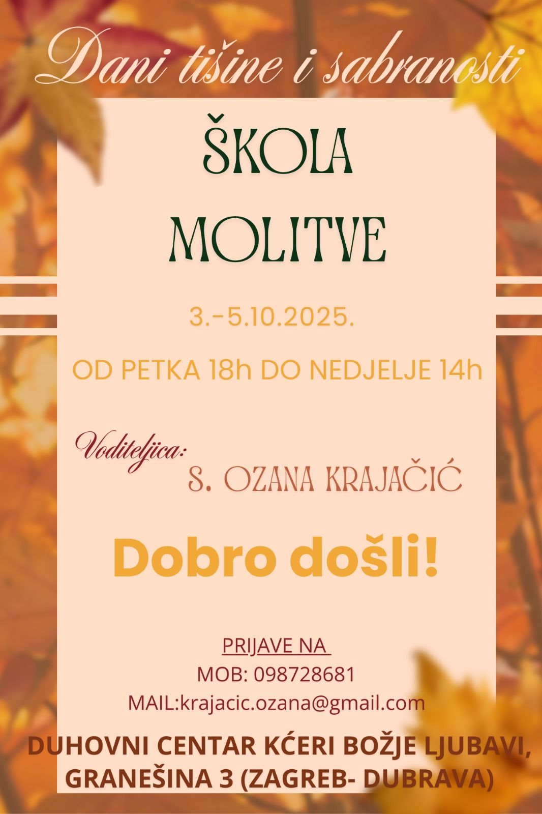 U Duhovnom centru u Granešini od 3. do 5. listopada 2025. održat će se Škola molitve koju organizira i vodi s. M. Ozana Krajačić.