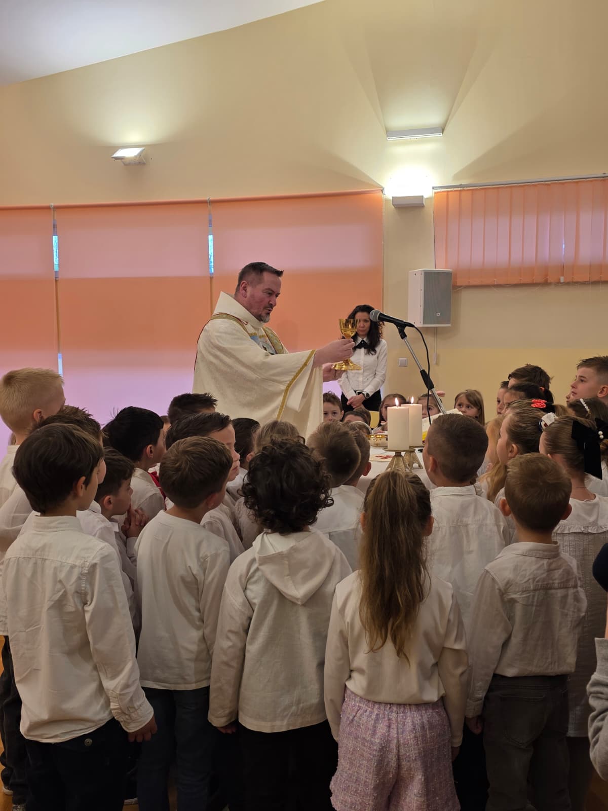 Uslijedilo je euharistijsko slavlje koje je predslavio pater Karlo Mario Petrović, Misionar Krvi Kristove. Vrtićka djeca mlađe i starije mješovite skupine pjevanjem su animirala svetu misu. Glazbeno su ih pratili s. Ružica Golik, odgojiteljica starije mješovite skupine, i gospodin Josip Gečević, tata jednog vrtićanca. Pater Karlo je nakon navještenog evanđelja započeo razgovor s djecom o sv. Josipu, tko je on bio, kakav je bio i koja je bila njegova uloga u životu Isusa i Marije. Djeca su navela da je Josip bio Isusov otac te da je bio dobar, jak i hrabar. Istaknula su da je njegova uloga bila brinuti o Isusu i Mariji. Nadalje ih je p. Karlo potaknuo da na primjeru sv. Josipa navedu kakvi bi trebali biti njihovi očevi. Djeca su istaknula da bi trebali biti hrabri i jaki te da trebaju brinuti i voljeti svoju djecu, odnosno svoju obitelj.