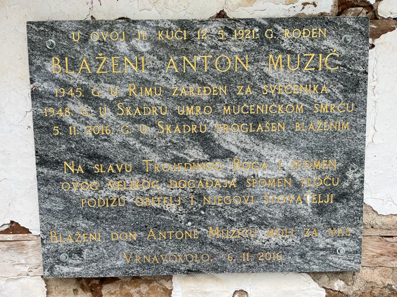 Don Anton Muzić rođen je 12. svibnja 1921. u Vrnavokolu, koje je tada pripadalo žipi Letnica. Srednju školu završio je u Papinskom sjemeništu u Skadru, a 1938. odlazi u Rim u Kongregaciju za Propagandu vjere. Za svećenika je zaređen 19. ožujka 1945. u Rimu. Nakon povratka u Albaniju, imenovan je nadbiskupijskim kancelarom. Komunistički režim uhitio ga je 20. svibnja 1947. i odveo u istražni zatvor gdje je bio neljudski mučen, jer se nije htio odreći svoje vjere i pripadnosti Katoličkoj Crkvi. Suđenje mu je bilo 14. siječnja 1948. Izmrcvaren i teško bolestan pušten je u proljeće 1948. iz zatvora te je umro u strašnim bolovima, ležeći ispod stepenica na ulazu u zgradu nadbiskupije u Skadru.