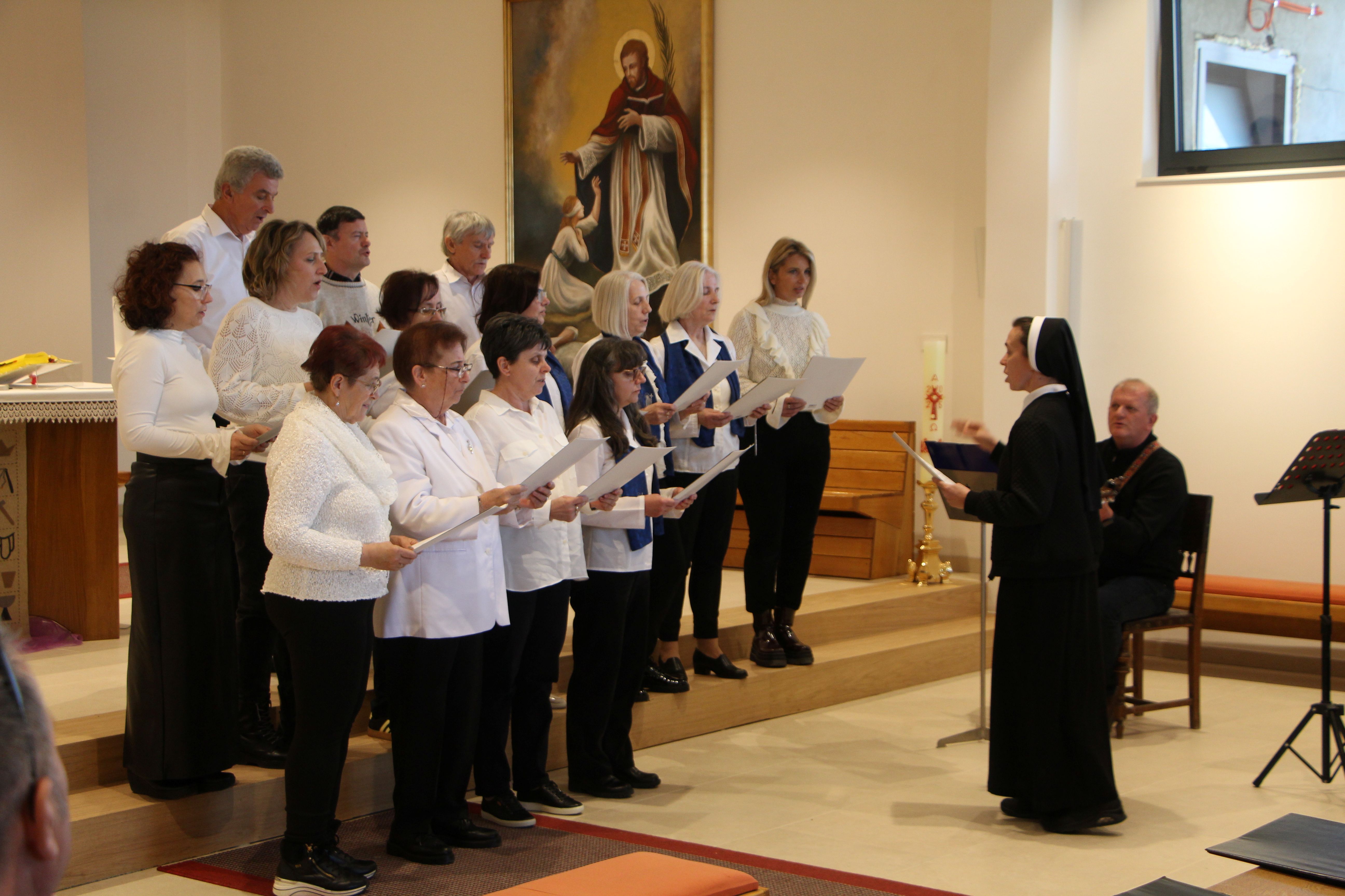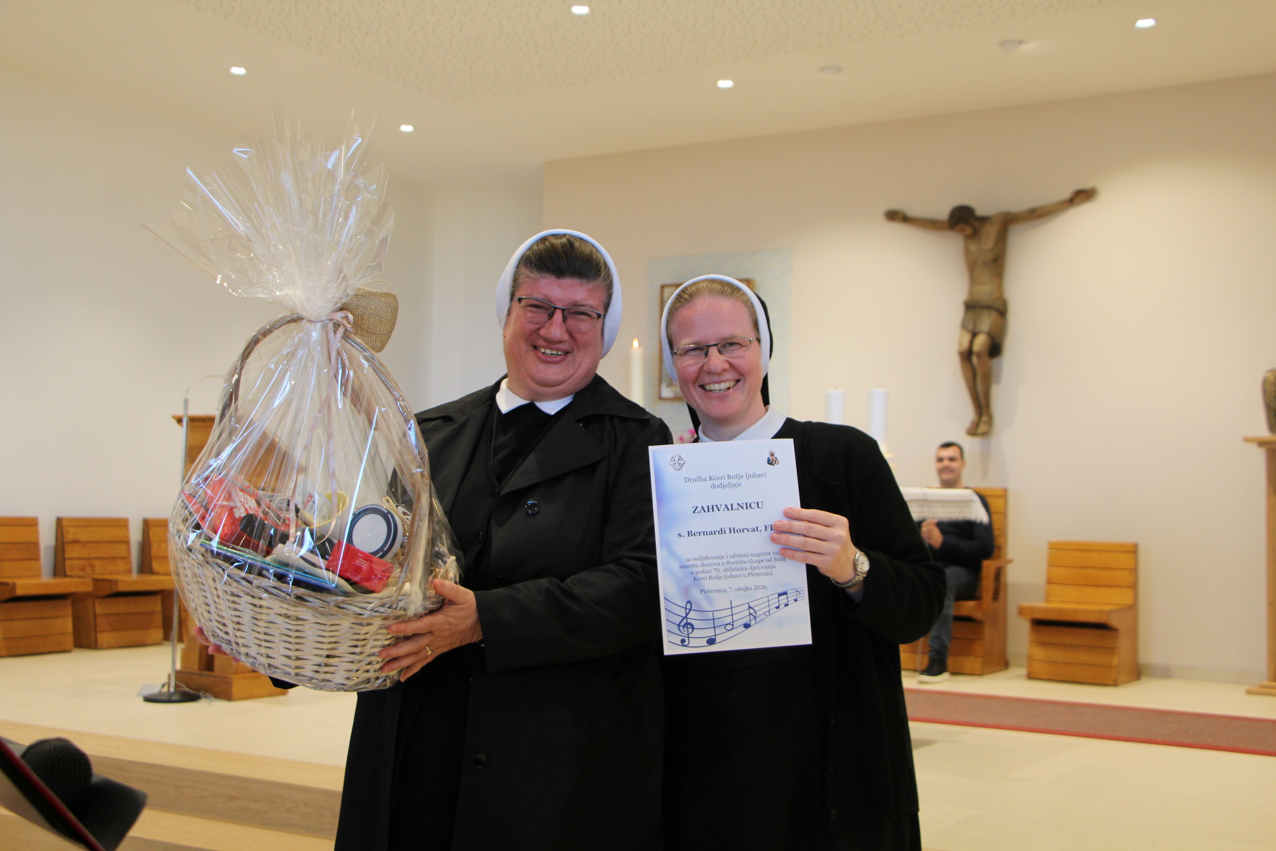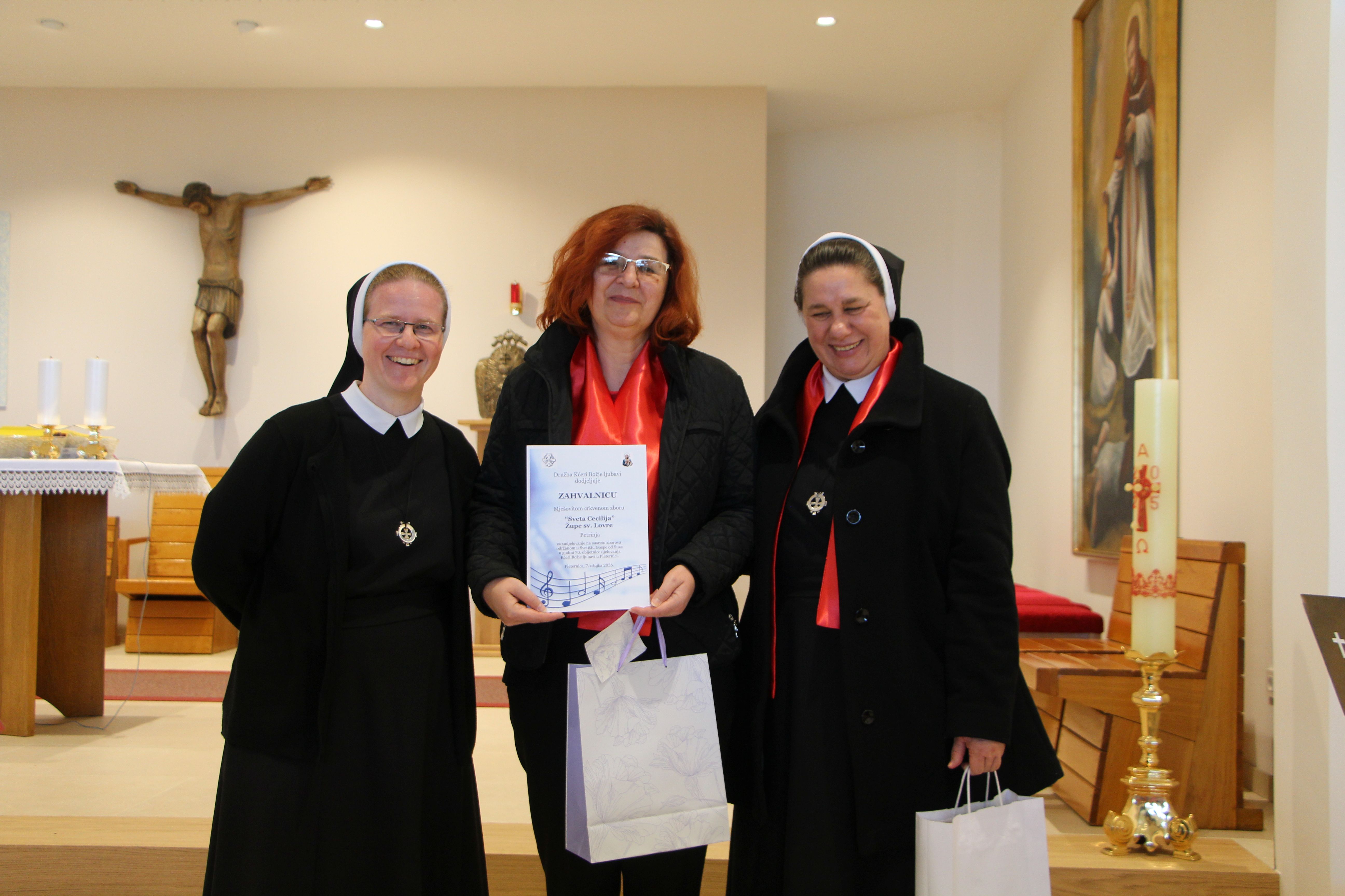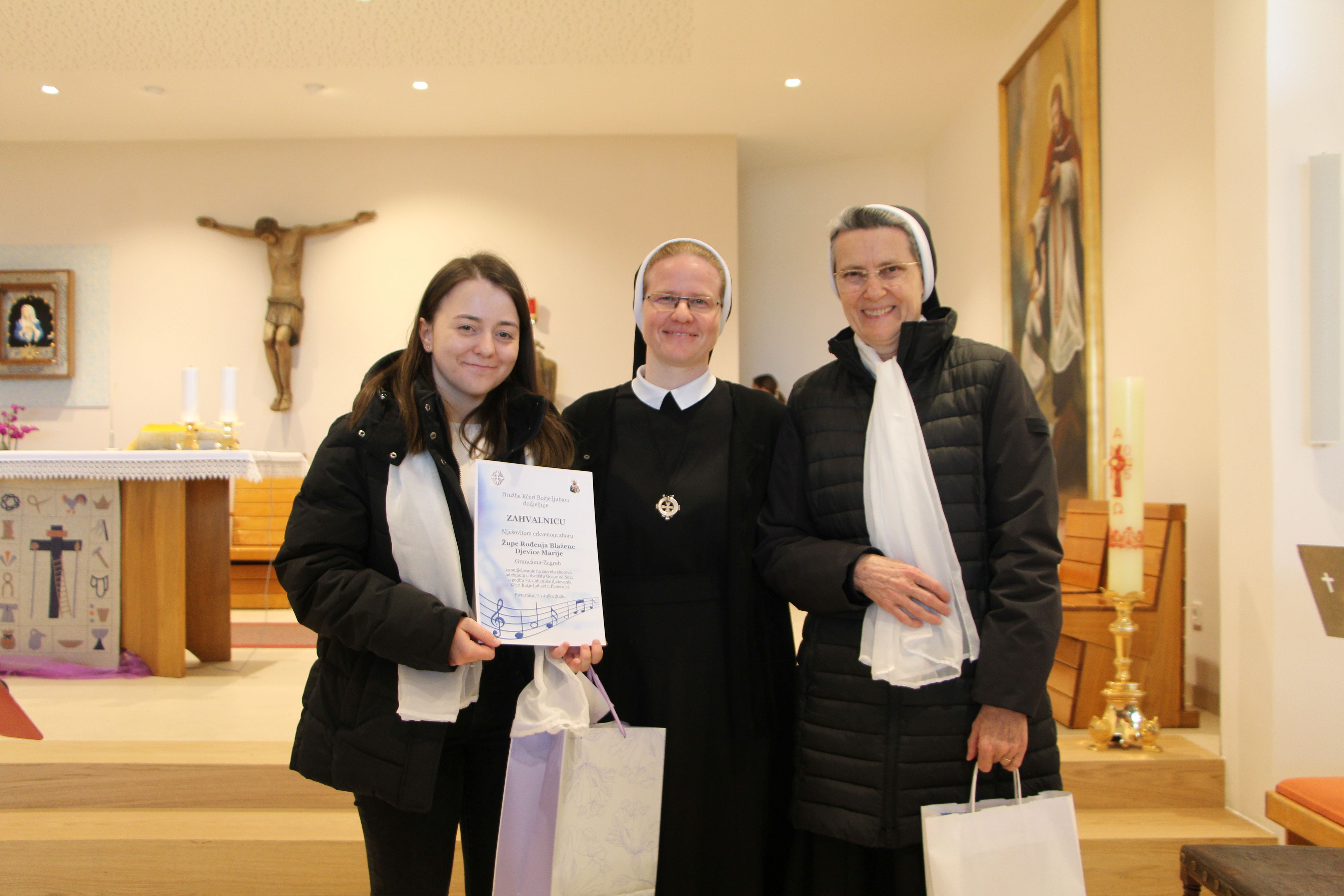 Susret župnih zborova koje vode Kćeri Božje ljubavi, pod nazivom „Vodi u nebo“, uzetim iz načela Majke Franziske Lechner, utemeljiteljice Družbe, održan je 7. ožujka 2026. u Župi sv. Nikole biskupa i Svetištu Gospe od Suza u Pleternici.