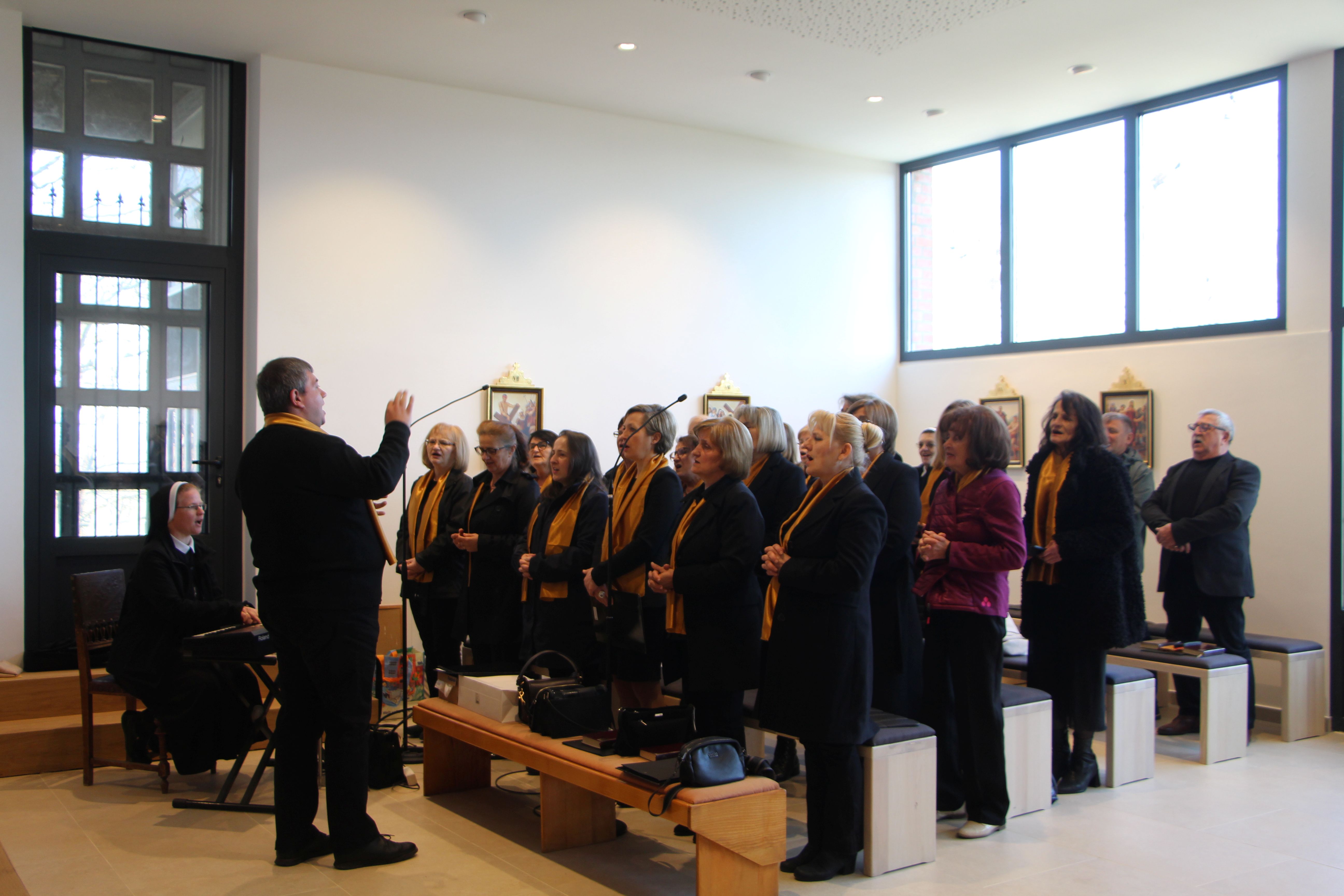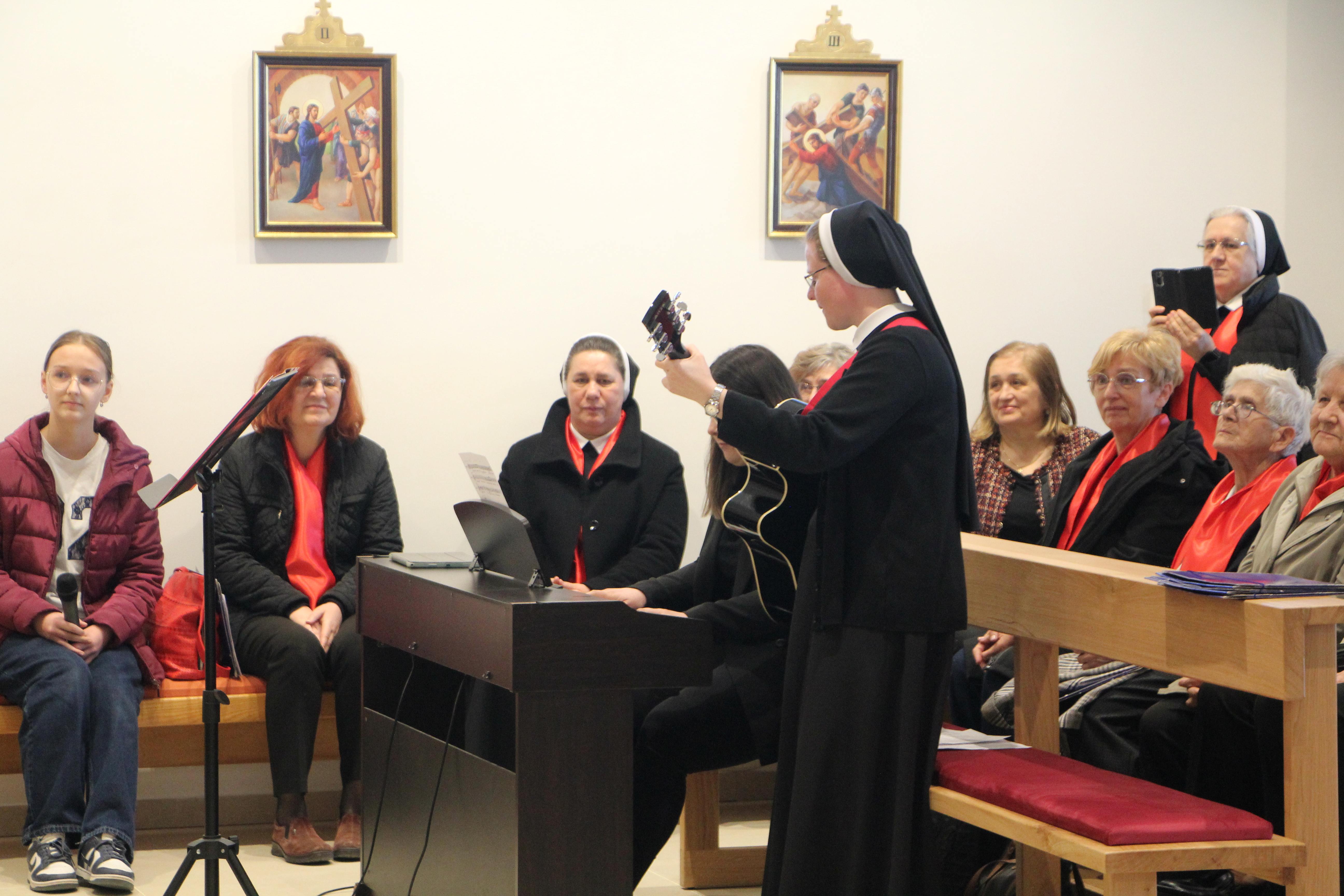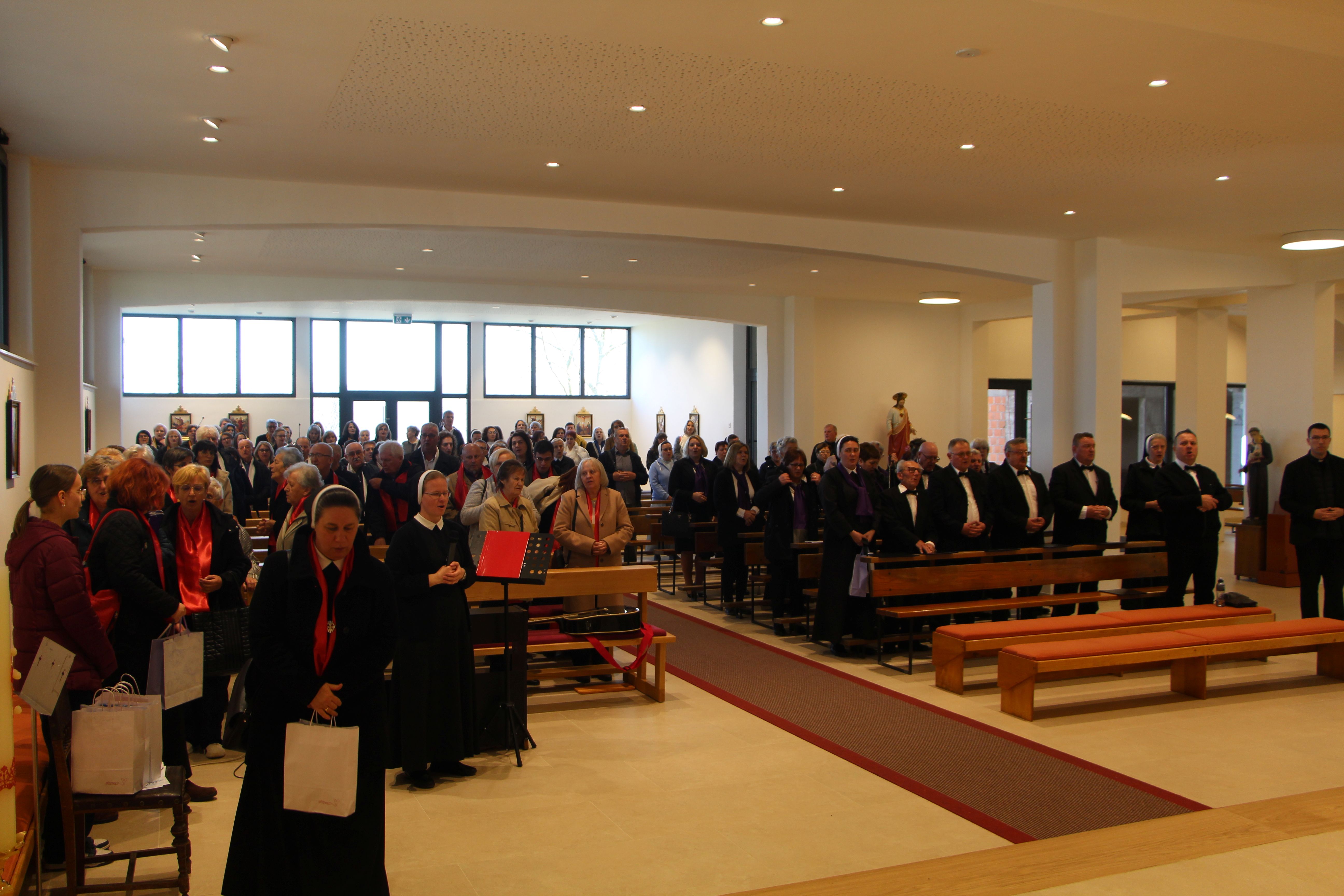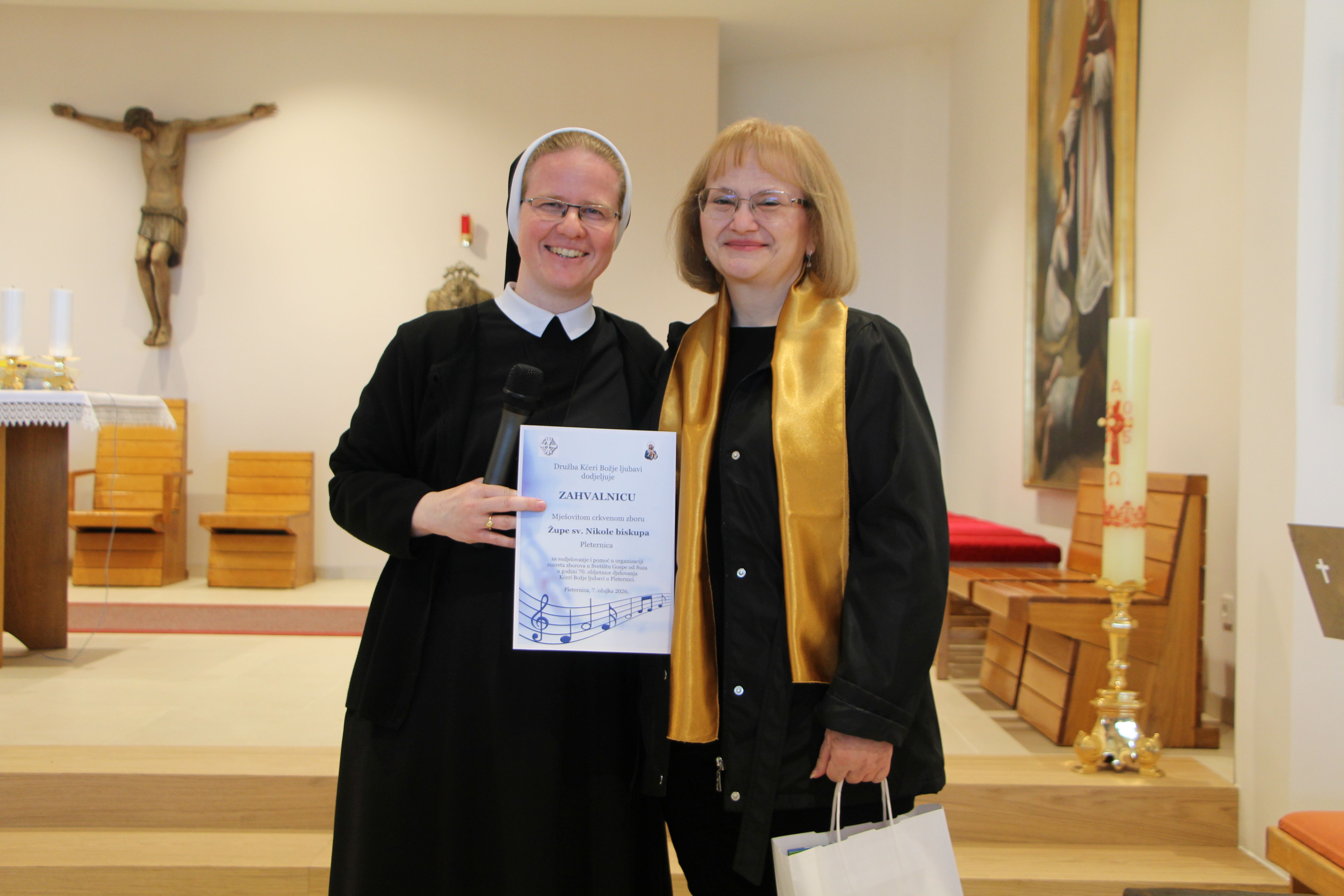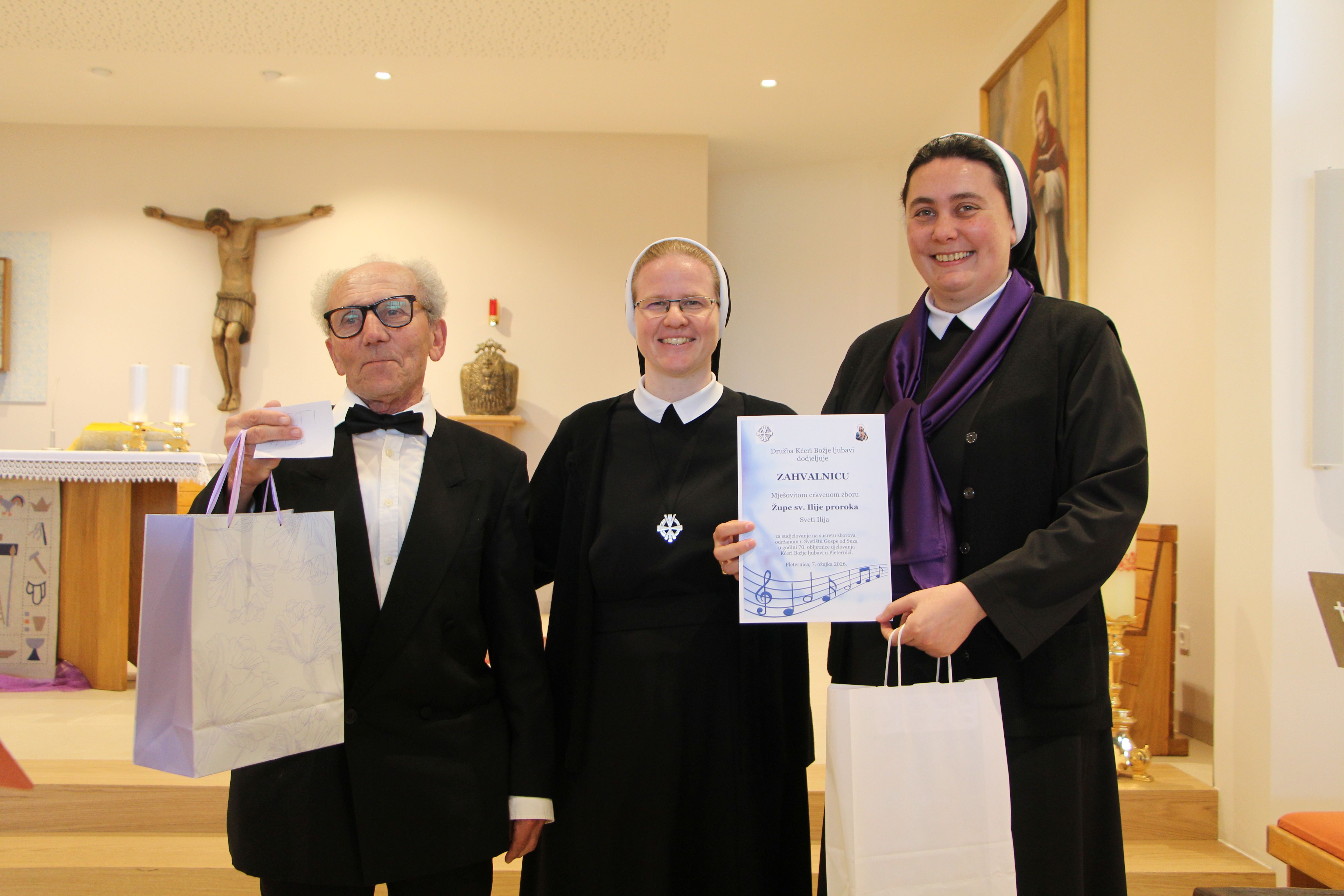 Susret župnih zborova koje vode Kćeri Božje ljubavi, pod nazivom „Vodi u nebo“, uzetim iz načela Majke Franziske Lechner, utemeljiteljice Družbe, održan je 7. ožujka 2026. u Župi sv. Nikole biskupa i Svetištu Gospe od Suza u Pleternici.